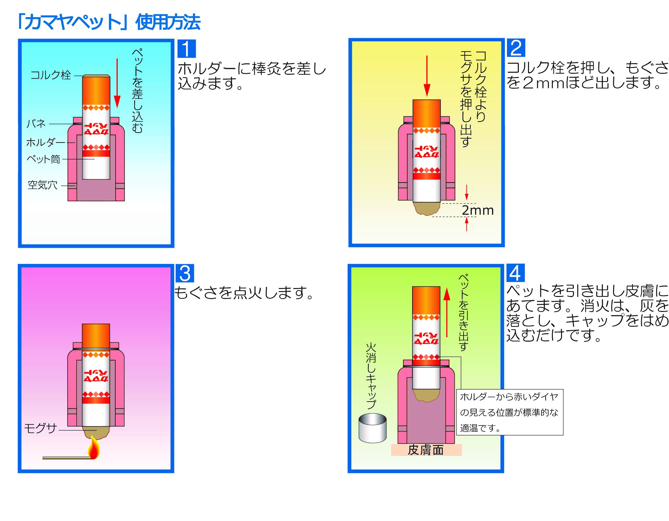 (2)カヤマペットを支え、コルクを押し、もぐさを2mm程度出しもぐさに点火する。